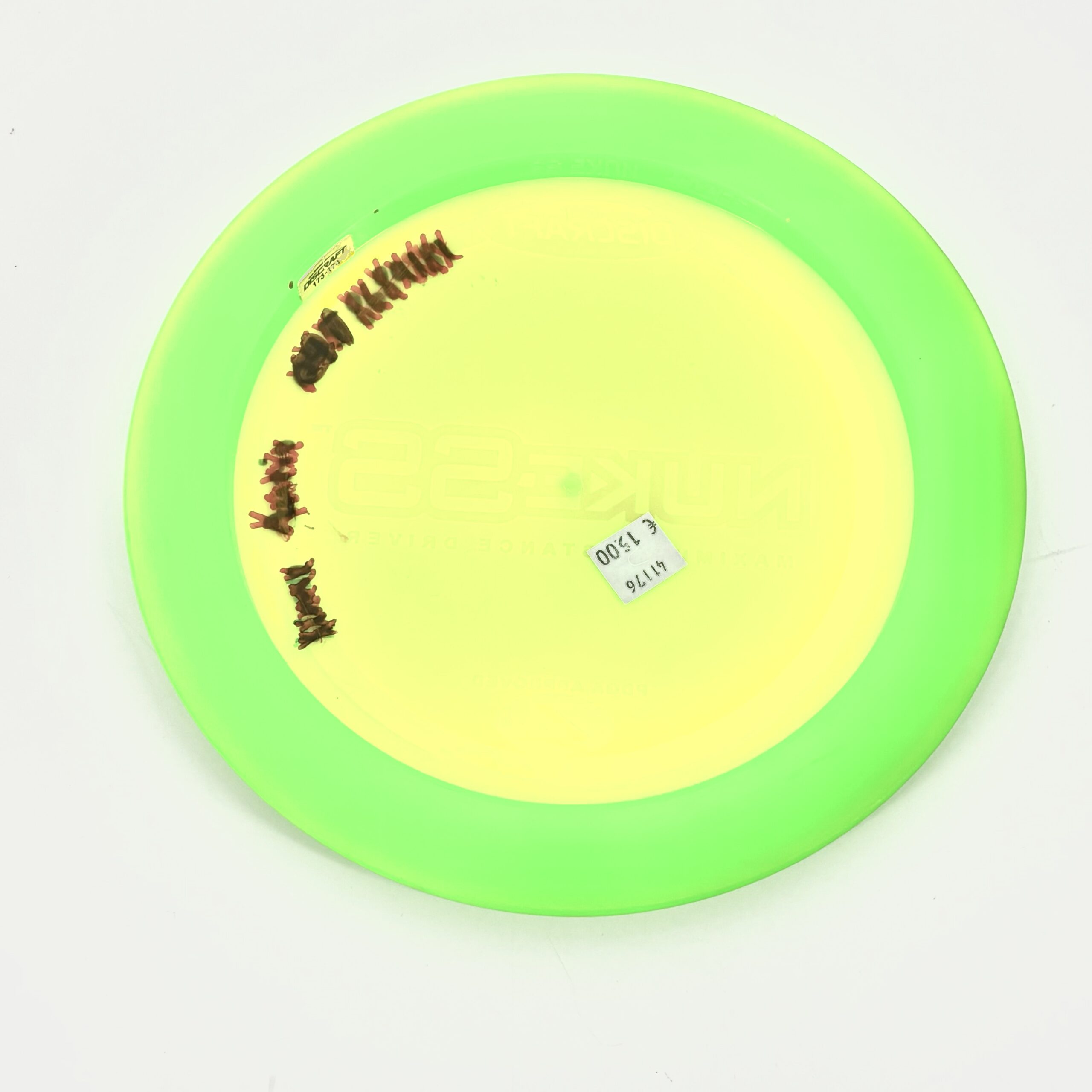 Erinomainen = muutamia kertoja testiheitetty kiekko, ei siis varsinaisesti peli/treenikäytössä ollut koskaan. Ei jälkiä tai aivan minimaalisia kosmeettisia sellaisia jotka näkyy vasta tarkkaan etsimällä, esim. valoa vasten heijastamalla. Lentorata täysin sama kuin uutena.