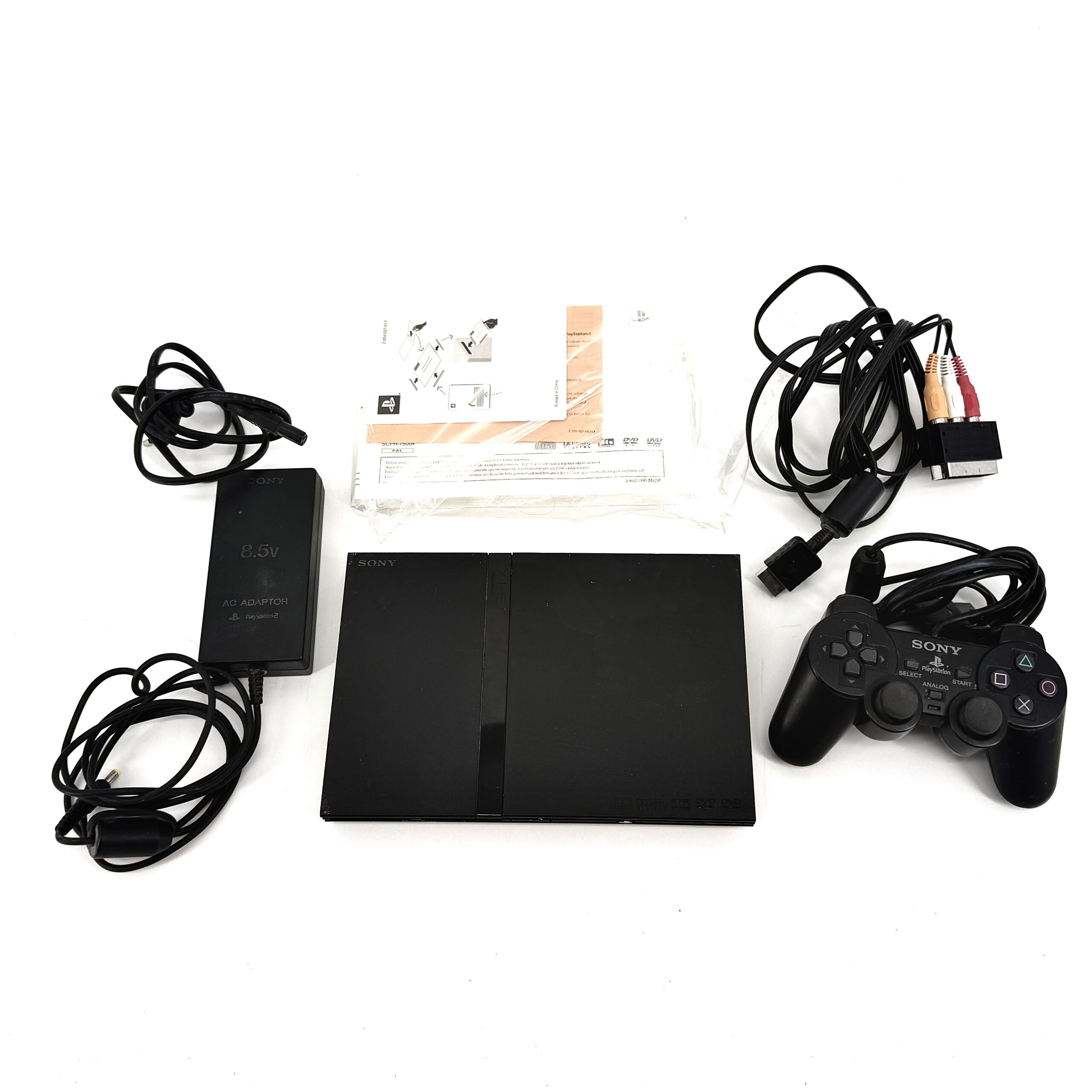 Ps2 pelikonsoli. Mukana tulee Sony Dualshock 2 ohjain, virtajohto ja videokaapeli.