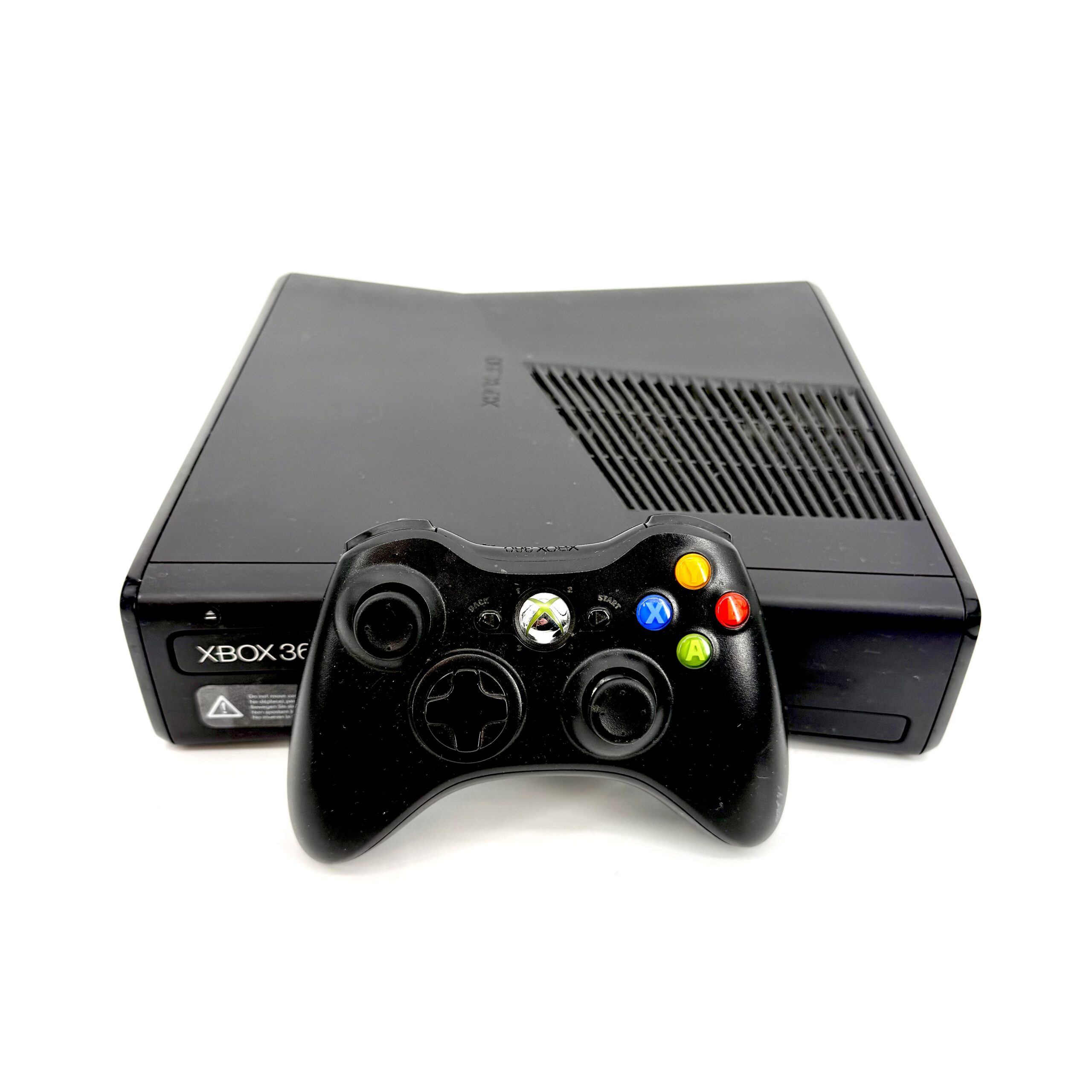 Xbox 360 Slim pelikonsolipaketti. Mukana tulee Microsoft ohjain, HDMI ja virtajohto.