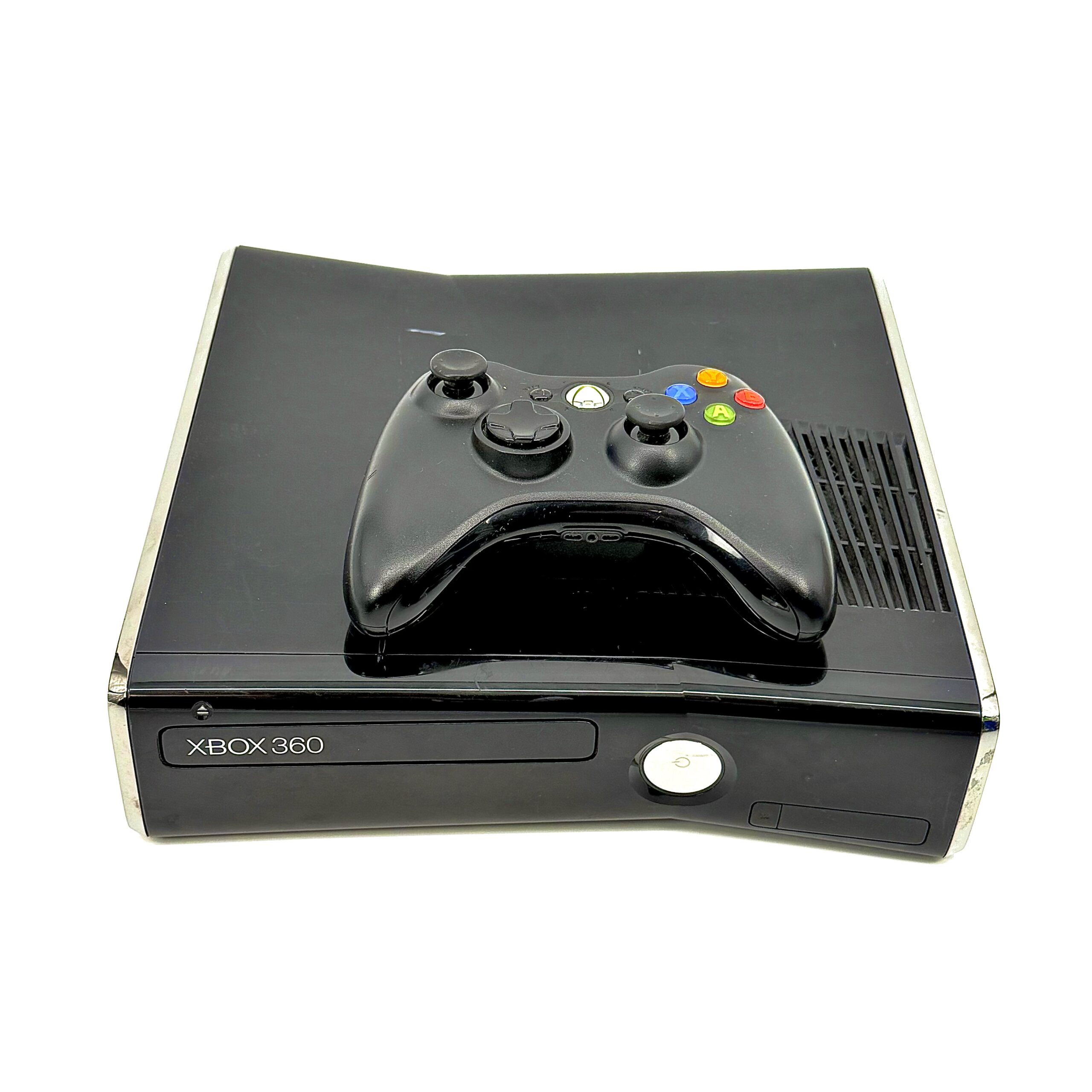 Xbox 360 Slim pelikonsolipaketti. Mukana tulee Microsoft ohjain, HDMI ja virtajohto.